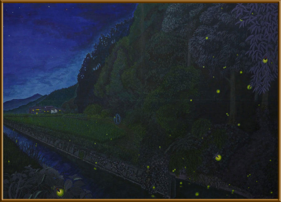 綺麗な水の流れる小川と水田に舞うホタルの様子を描いてみました。